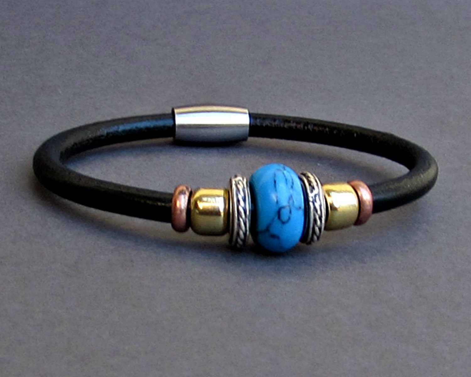 Turquoise Leather Bracelet For Men Women Beaded Gemstone Bracelet Silver Bracelet Boyfriend Gift Mens Jewelry customized to your wrist